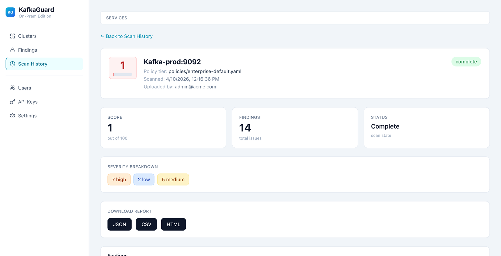 Drill into any scan to see severity breakdown, download reports (JSON/CSV/HTML), and view findings.