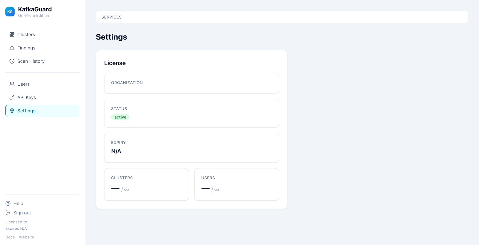 View license status, cluster/user usage, and organization details.